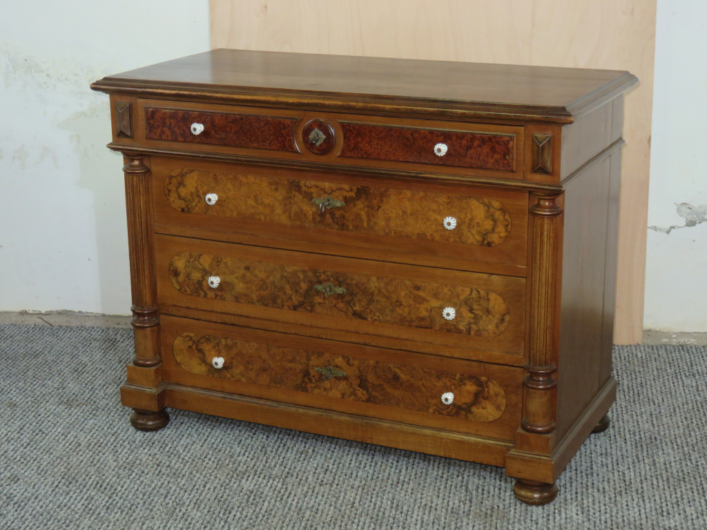 Professionally restored furniture. Authentic veneered 4-drawer chest, with elegant porcelain knobs