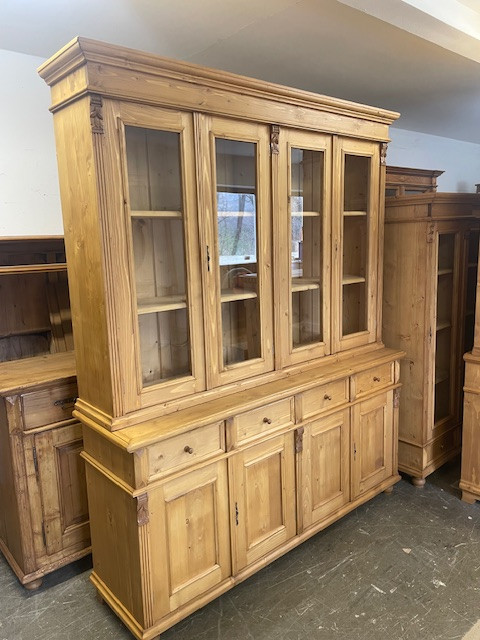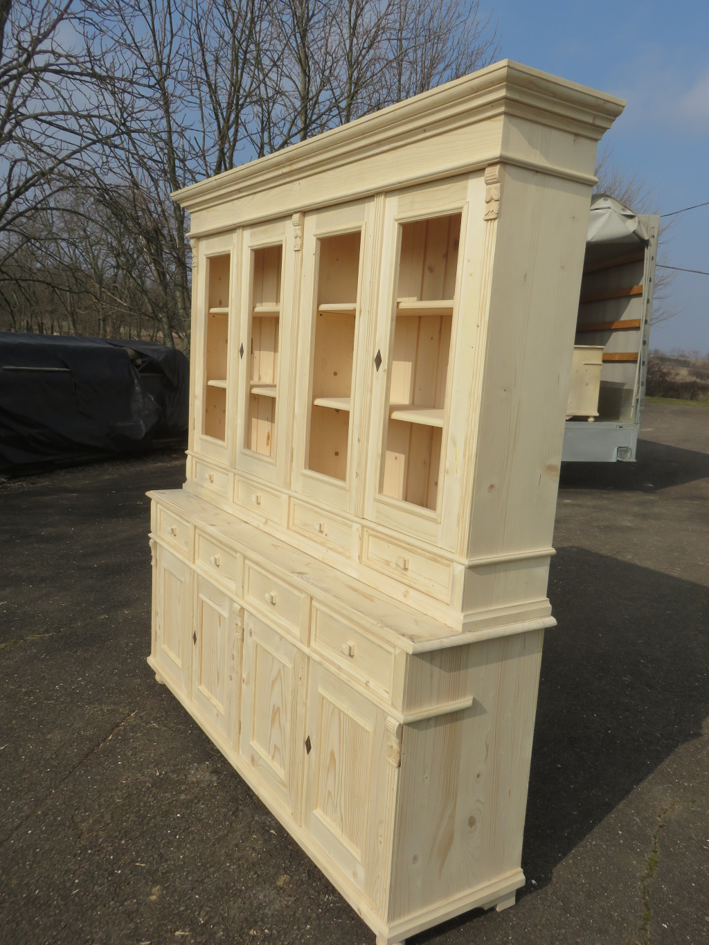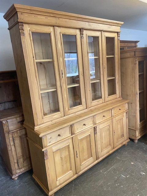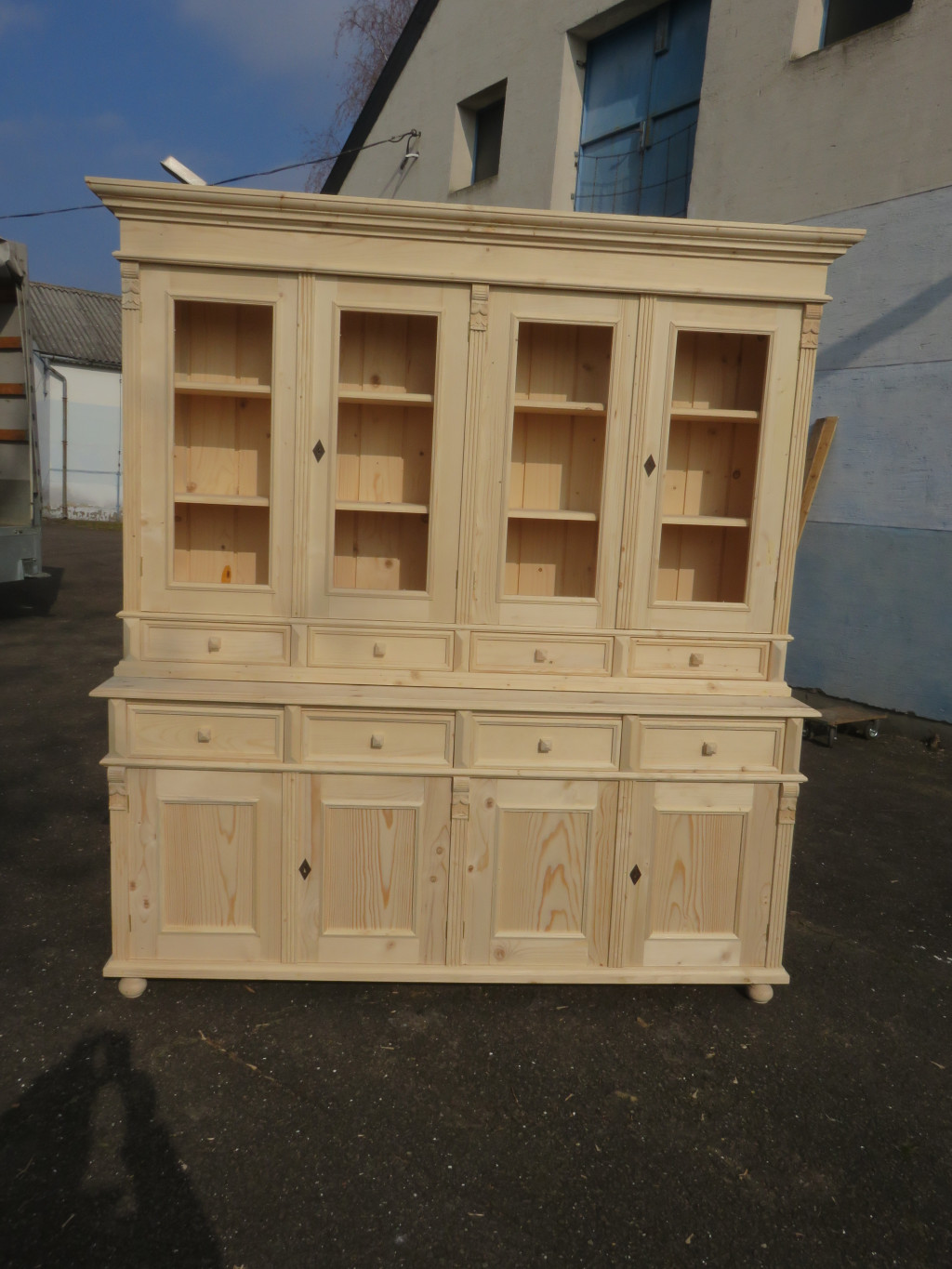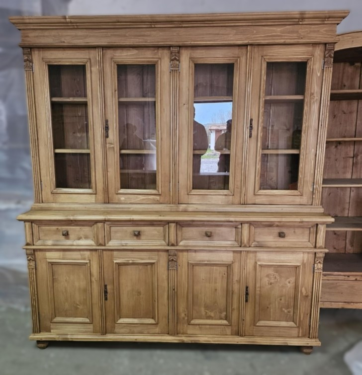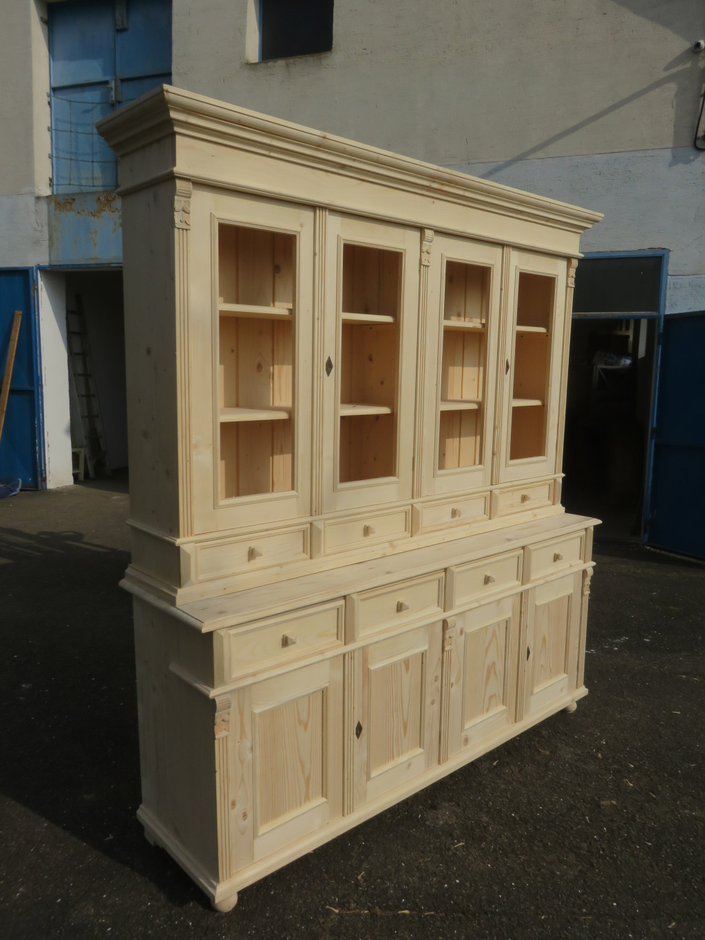 Shop Cabinet with four double doors and eight drawers, bare wood
